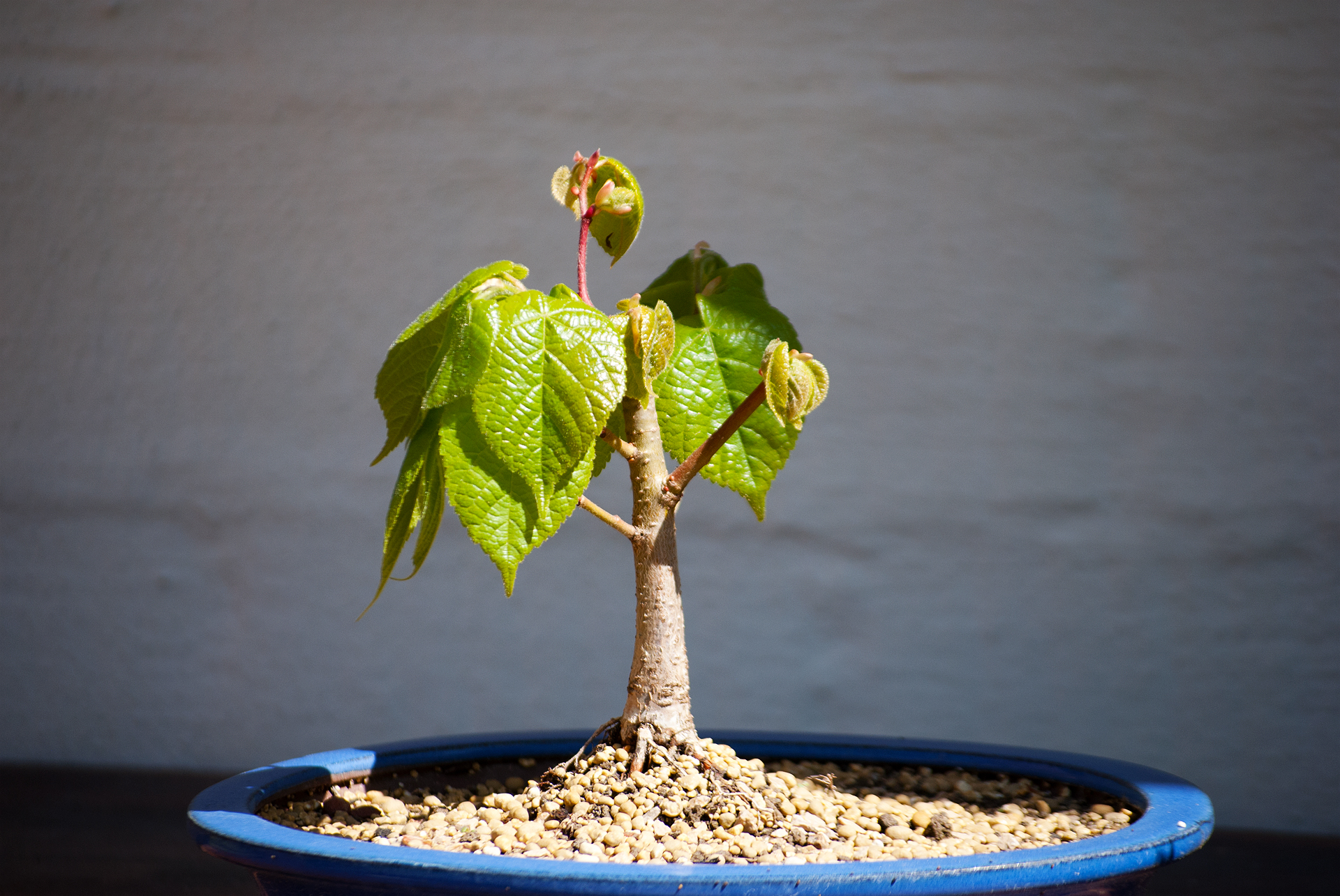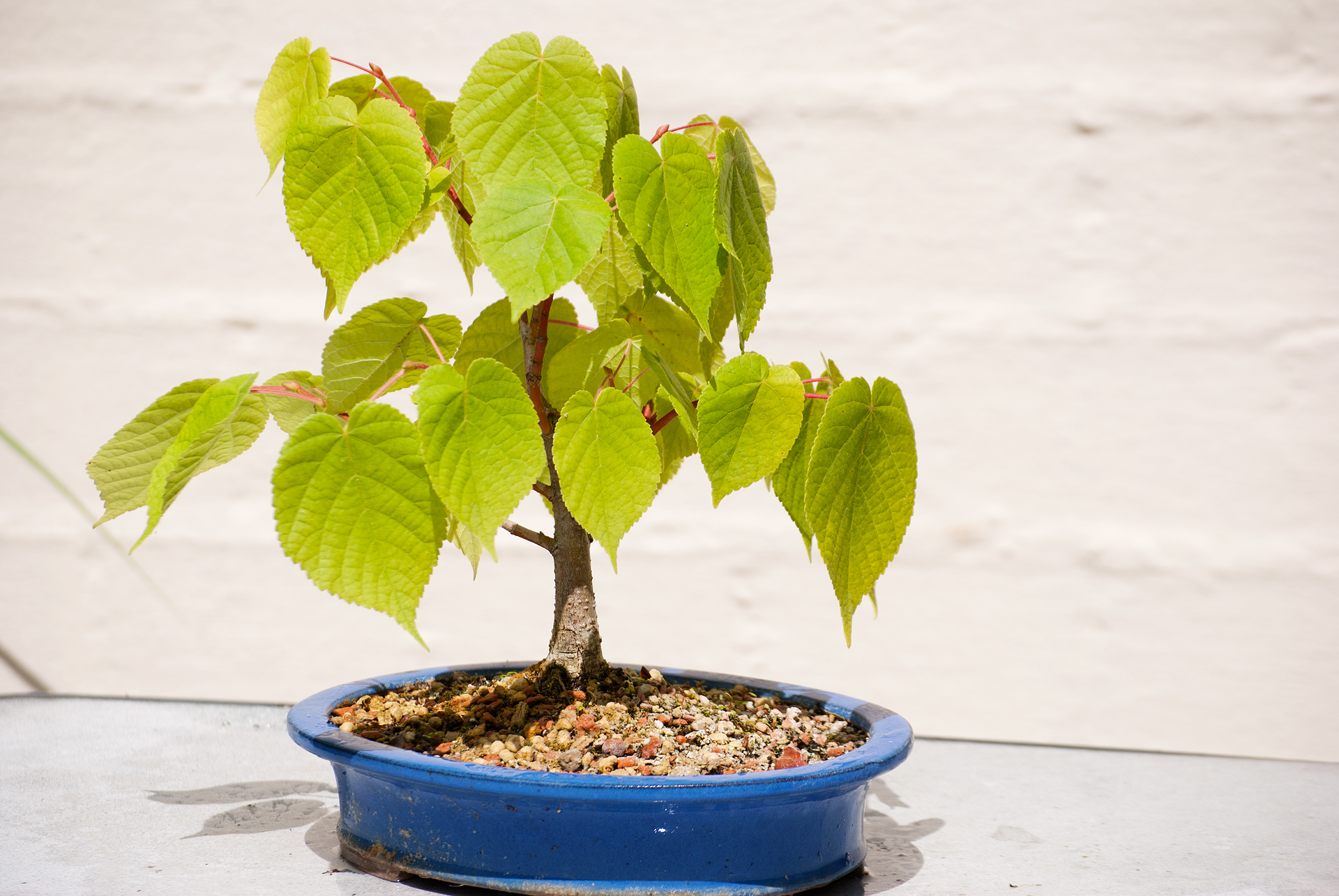Diese Sommerlinde hat sich als Samen in einen Blumentopf auf dem Balkon verirrt. Nachdem sie als Linde zu erkennen war, wurde sie 2011 zum Training in einen Teichkorb gefplanzt. Seitdem bekommt sie jeden Herbst einen Formschnitt und alle zwei bis drei Jahre einen Wurzelschnitt.